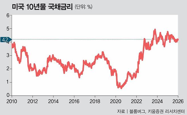 2026년 들어서도 마찬가지다. 한국 코스피는 1월 21일 기준 연초 대비 18% 넘게 급등해 미국, 유럽, 일본 등을 제치고 전 세계 수익률 1위를 기록하고 있다. 고객 예탁금도 90조 원대를 넘는 등 유동성 여건 역시 풍부해 22일에는 상징적인 레벨인 5000포인트도 돌파했다. 또한 '이익 모멘텀의 견조함+낮은 밸류에이션 부담' 조합이 훼손되지 않는 한 증시 상승 기조는 유지될 가능성이 크다.하지만 이렇게 긍정적인 상황에서 금융시장 참여자에게 불편함을 제공하는 요인이 있다. 미국 10년물 국채금리가 심리적 저항선인 4.2%를 상향 돌파하는 등 금리 상승 문제가 그것이다(그래프 참조). 주식시장 밸류에이션의 할인율로 작용하는 시중금리 급등은 고평가 논란이 있는 기술주를 중심으로 차익실현 욕구를 자극하기에 충분한 소재다. 연초 이후 미국 증시가 강세를 보이지만 장중 변동성이 빈번하게 높아지는 것도 바로 금리 상승 부담에 기인한다. 미국 연방준비제도이사회(연준)가 지난해 12월 연방공개시장위원회(FOMC) 정례회의에서 금리를 인하했음에도 미국 시중금리가 좀처럼 내려가지 않는 본질적 원인은 단순한 수급이나 경제지표가 아니라 트럼프발(發) 정치적 불확실성에 있다.