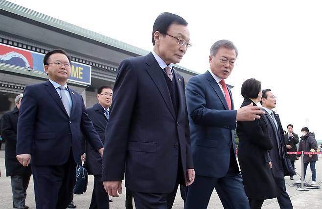| ▲ 문재인 대통령이 지난 27일 오후 경기도 성남 서울공항에 도착, 더불어민주당 이해찬 대표와 대화하며 이동하고 있다. 018.11.28 |