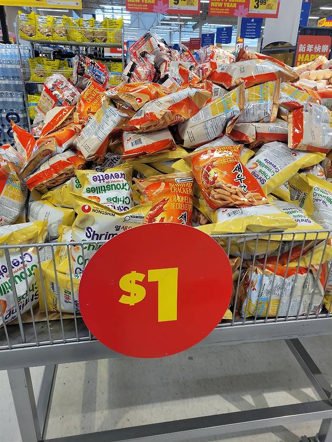 | ▲ 캐나다 슈퍼스토어 매장 통로의 철제 덤프 빈에 한국의 대표 스낵인 새우깡이 가득 쌓여 판매되고 있다. 1달러라는 파격적인 할인가가 적힌 빨간 표지판이 강렬한 존재감을 드러낸다. |