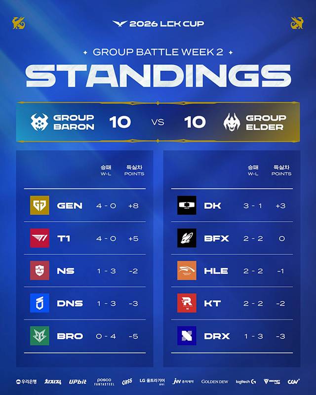 2026 LCK컵 2주 차가 역대급 명경기들을 속출하면서 팬들의 뜨거운 호응을 이끌어내고 있다. 바론 그룹과 장로 그룹이 맞대결을 펼치는 그룹 대항전 결과는 10승 10패로 우열을 가리지 못하고 있고 10킬 이상 차이가 나는 경기가 뒤집어지는 등 명승부가 연이어 나오고 있다.