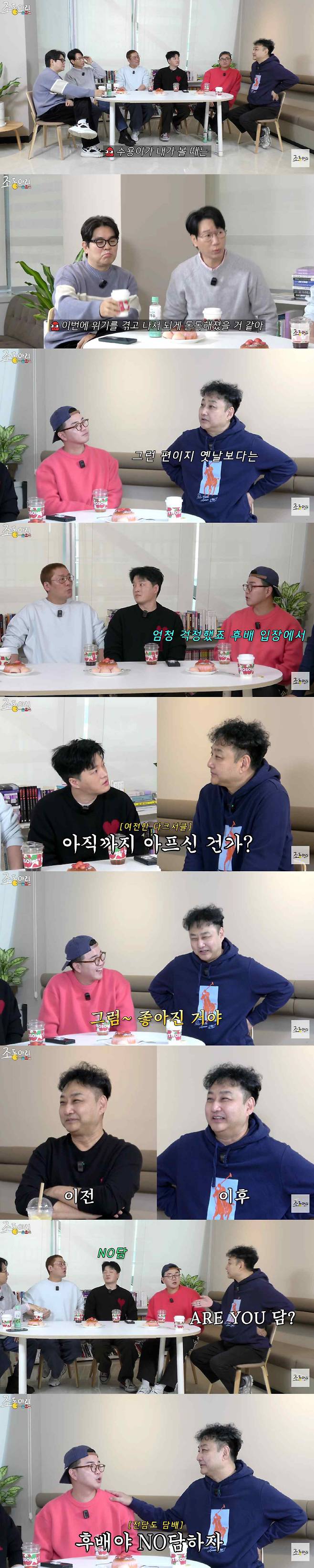 이를 듣던 남호연은 "지금은 웃으면서 이야기하지만, 후배들 입장에서는 기사로만 접해서 정말 걱정했다"고 당시 심경을 전했다. 김승진 역시 "그때는 직접 연락을 못 드렸고, 회복 소식을 듣고 바로 문자를 보냈다"며 "'고맙다'고 바로 답장이 와서 안도했지만 정말 걱정됐다"고 회상했다.