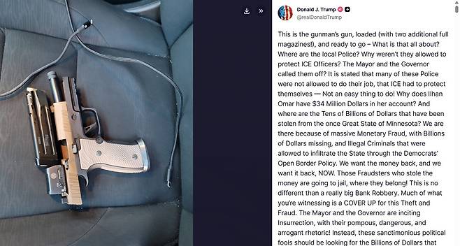 | ▲ 트럼프 대통령은 자신의 SNS에 권총 사진을 올리며 "이것이 총기 소유자의 총"이라고 주장하면서 "지역 경찰은 어디에 있나? 왜 그들은 ICE 요원들을 보호하도록 허가받지 못했나"라며 오히려 지역 경찰의 외면 아래 ICE 요원들이 공격당하고 있다고 비난했다 |