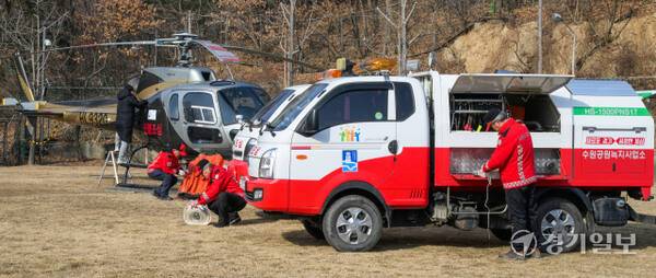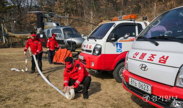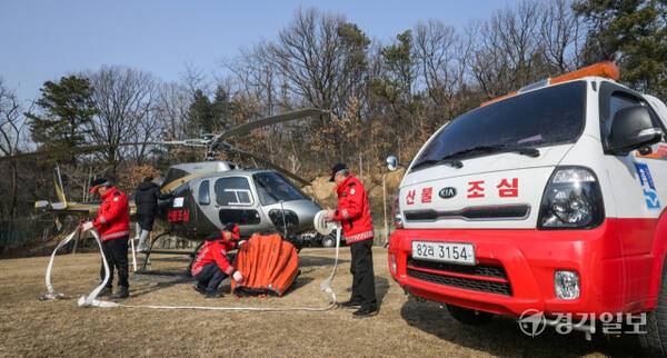 건조한 날씨가 이어지며 경기도 대부분 지역에 건조특보가 발효된 26일 수원특례시 장안구 산불진화헬기 임시계류장에서 산불전문예방진화대원들이 진화장비를 점검하고 있다. 수원시는 공원녹지사업소와 4개 구청 등 5곳에서 산불방지대책본부를 운영하고 있다.
