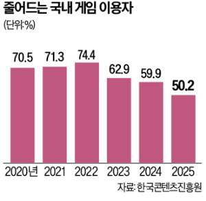 더 큰 문제는 산업 기반인 이용자 저변이 빠르게 약화하고 있다는 점이다. 한국콘텐츠진흥원의 ‘2025 게임이용자 실태조사’에 따르면 지난해 국내 게임 이용률은 50.2%로 전년 대비 9.7%포인트 감소해 역대 최저치를 기록했다. 이탈한 이용자 10명 중 8명가량은 대체 여가 활동으로 장시간 몰입이 불필요한 온라인동영상서비스(OTT), TV, 영화, 애니메이션 등을 선택한 것으로 파악됐다.