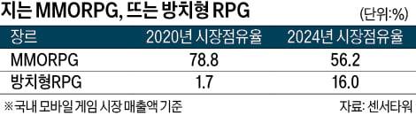 대표적인 전략이 방치형·캐주얼 등 저몰입 장르의 확장이다. 넥슨은 지난해 10월 출시한 방치형 역할수행게임(RPG) ‘메이플 키우기’가 흥행한 이후 ‘바람의나라’ IP를 활용한 방치형 RPG 상표권을 잇달아 출원했고, 넷마블과 그라비티도 관련 신작을 내놓고 있다. 센서타워에 따르면 방치형 게임의 국내 모바일 시장 비중은 2020년 1.7%에서 지난해 16%로 급증했다. 같은 기간 MMORPG는 78.8%에서 56.2%로 비중이 줄었다.