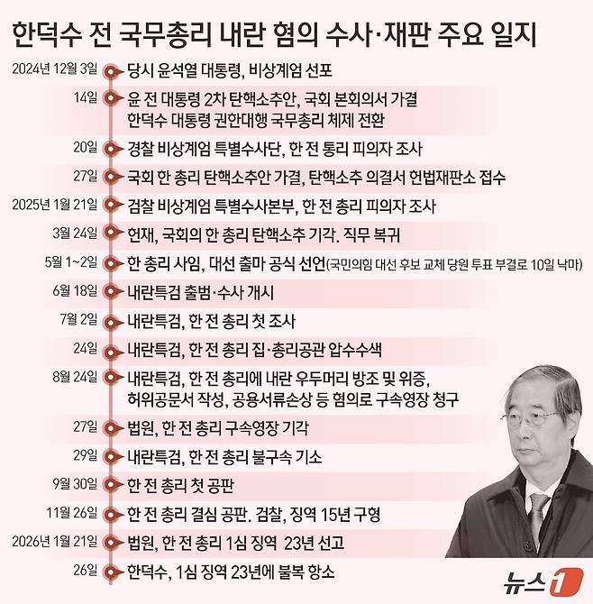 (서울=뉴스1) 김초희 디자이너 = 12·3 비상계엄과 관련해 내란 중요임무 종사 혐의를 받는 한덕수 전 국무총리가 1심에서 징역 23년을 선고받자, 한 전 총리 측이 판결에 불복해 26일 서울중앙지법 형사합의33부(부장판사 이진관)에 항소장을 제출했다. 판결이 선고된 지 5일 만이다.