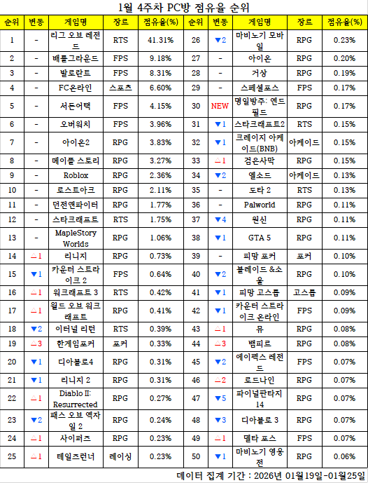 한 주간의 PC방 순위를 되짚어 보고, 어떤 변화가 있었는지 알아보는 'PC방순위' 코너입니다. 데일리게임은 매주 PC방 순위를 일목요연하게 정리, 독자들이 알아보기 쉽도록 제공합니다. 지난 한 주간 어떤 PC 온라인게임들이 눈길을 끌었는지 살펴봤습니다. < 편집자주 >
