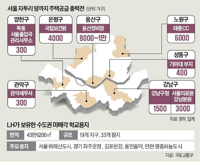 LH(한국토지주택공사)가 소유한 수도권 미매각 학교용지(33개 필지, 43만6200㎡)에도 주택 공급이 추진된다. 서울에서는 송파구 위례신도시와 강남구 세곡동 학교 용지, 강동구 강현중(서울도시주택공사 소유) 등이 거론되고 있다. 대규모 아파트 단지와 인접한 데다 위례신사선 역세권이어서 교통 여건이 좋다는 평가다. 경기권에서는 수원 호매실지구와 남양주 별내지구, 김포 한강신도시 내 미개발 학교용지가 대책에 포함될 것으로 전해졌다. 교육청이 아니라 정부와 서울시 산하 공사가 소유하고 있어 조기 착공이 가능할 것으로 예상된다. 정부는 이들 부지에서 지난해 ‘9·7 대책’에서 제시한 물량(3000가구)의 두 배인 6000가구 공급이 가능할 것으로 보고 있다.