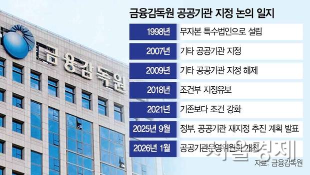 ‘금융감독원 공공기관 지정’이 뜨거운 감자로 급부상했다. 이달 말 열리는 재정경제부 산하 공공기관운영위원회에서 금감원의 공공기관 포함 여부가 논의될 예정이기 때문이다. 금감원은 2009년 기타공공기관에서 지정 해제된 후 17년간 독립성을 유지해왔다.