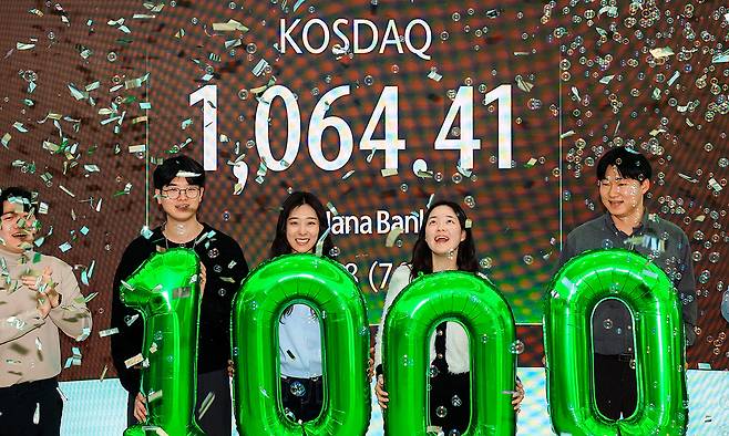 | 축하 세리머니 코스닥지수가 4년 만에 1000선을 넘은 26일 서울 중구 하나은행 본점에서 직원들이 ‘천스닥’ 돌파 축하 세리머니를 하고 있다. 이날 코스닥은 장중 7% 넘게 급등하며 매수 사이드카가 발동됐으며, 1064.41로 마감해 종가 기준 2000년 9월6일(1074.10) 이후 약 25년5개월 만에 최고치를 기록했다. 이제원 선임기자 |