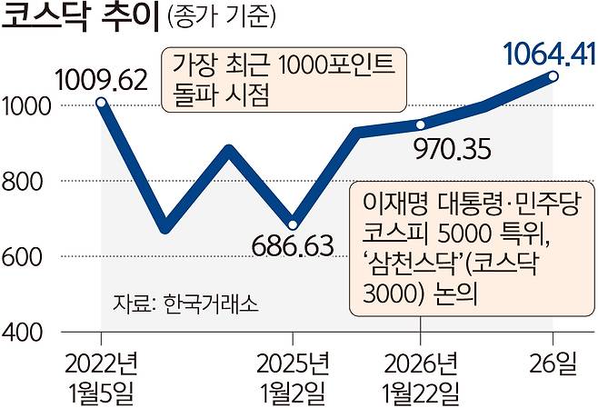 오천피 이어… 4년 만에 ‘천스닥’도 뚫었다