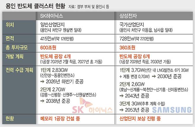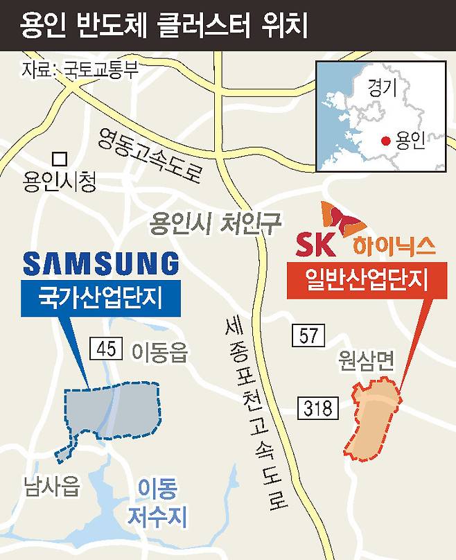 세계 최대 규모의 반도체 산업 집적지로 조성 중인 용인 반도체 클러스터는 크게 두 축으로 이뤄져 있다. 용인시 남동쪽의 원삼면 일대 일반산업단지엔 하이닉스가, 남서쪽의 이동·남사읍 내 국가산업단지엔 삼성전자가 초대형 반도체 공장을 짓는다. 전체 신설 공장 수만 무려 10개다. 삼성전자의 기흥·화성·평택 공장, 하이닉스의 이천·청주 공장 중심부에 현재 가동 중인 국내 반도체 공장들의 절반에 육박하는 생산시설이 이들 지역에 추가로 들어서는 것이다.
