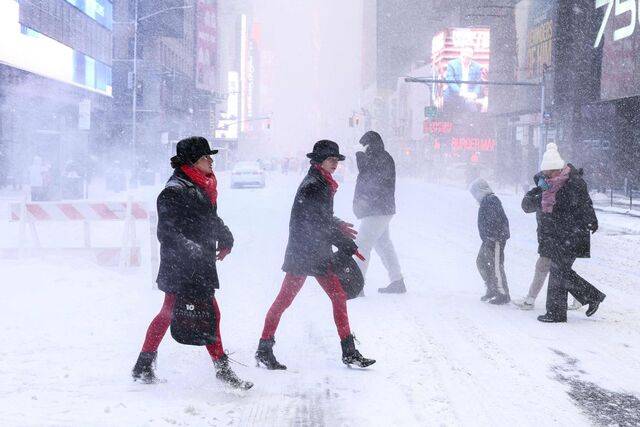 미국 뉴욕 맨해튼 6번가에서 25일(현지시간) 시민들이 눈보라 속에서 이동하고 있다.