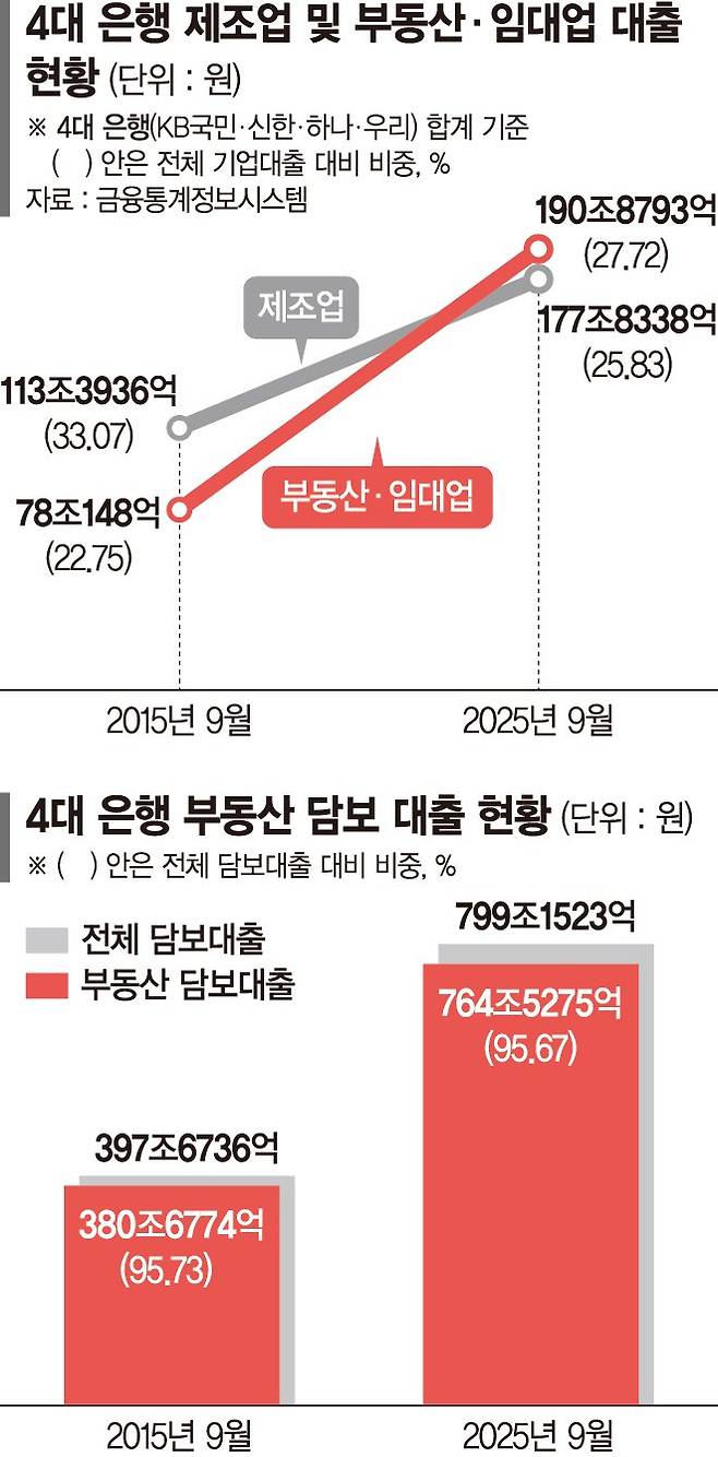 담보·신용·보증으로 구분한 유형별 대출 통계에서도 부동산 쏠림은 뚜렷하다. 2025년 9월 기준 4대 은행의 전체 담보대출 가운데 부동산 담보대출 비중은 95.67%에 이른다. 2015년 9월 이후 10년간 담보대출 규모는 약 2배 확대됐지만, 증가분의 대부분은 부동산 담보대출에서 발생한 것이었다.