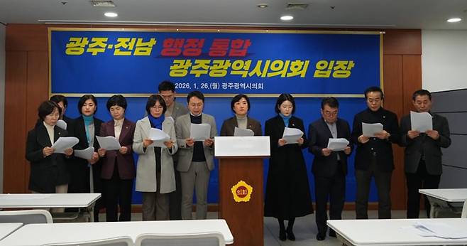 시의회는 26일 도의회에 행정통합 주요 쟁점을 논의하기 위한 ‘시·도의회 광주·전남 통합 공동 TF’ 구성을 제안하고 의원 정수 확대 등을 골자로 한 ‘광주전남특별시 설치를 위한 특별법’ 수정안을 광주·전남 행정통합추진기획단에 전달했다.