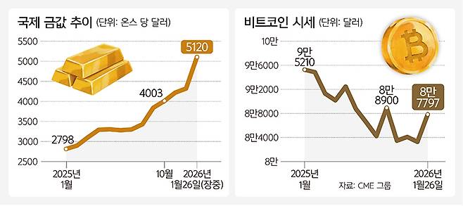 지정학적 긴장 고조와 '트럼프 리스크'로 인해 달러화를 대체할 안전 투자처로 귀금속 열풍이 부는 반면 '디지털 금'으로 불렸던 비트코인은 입지가 흔들리고 있다.
