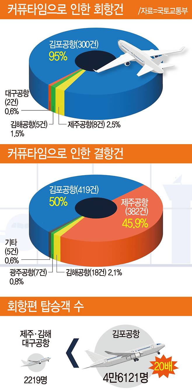 우선 김포공항은 국내 15개 공항 중 김포공항에서 커퓨타임으로 인한 항공편 회항과 결항이 가장 많이 발생한 곳이었다. 전체 회항(315건) 중 95.2%를 차지하는 300건이 발생했다. 나머지 15건의 회항이 발생한 제주공항(8건), 김해공항(5건), 대구공항(2건)에 비해서 현저히 많은 비행기가 운영시간에 의해 공항에 착륙하지 못하고 돌아갔다.