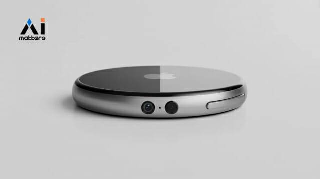 현재 개발 중인 애플 AI 핀은 알루미늄과 유리 외장을 갖춘 얇고 평평한 원형 디스크 형태로 제작되고 있다.