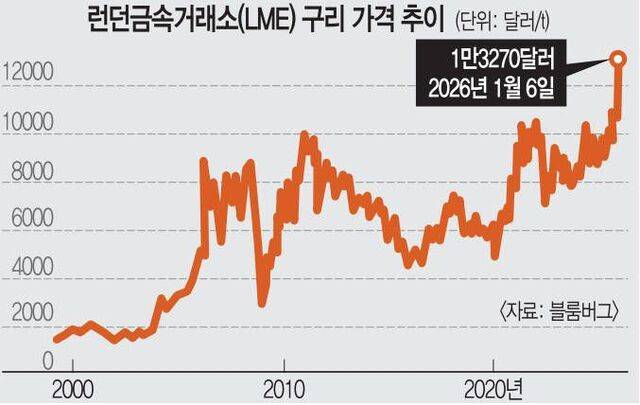 이 흐름은 구리 가격 급등세로 이어지고 있다. 런던금속거래소(LME) 구리 거래 가격은 지난해 말 t당 1만 달러(약 1442만원)를 돌파한 데 이어 올 들어 1만3000달러(약 1875만원) 선까지 치솟았다. 전력 수요 증가와 공급 제약이 맞물린 현 상황상 구리 가격 강세는 당분간 지속될 거라는 전망이 나온다.