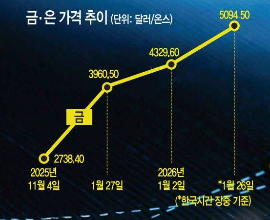 뉴욕상품거래소(COMEX)에 따르면 금 가격은 26일 온스당 5000달러를 돌파하면서 역대 가장 높은 수치를 기록했다. 금 가격은 장중 5100달러를 넘어서기도 했다. 금 가격은 2024년 27%, 지난해에도 65% 상승했다. 3년째 급등세를 이어가는 셈이다.