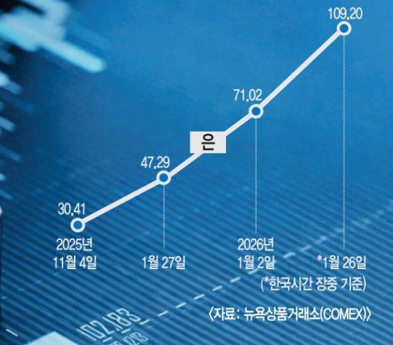 은 가격도 크게 올랐다. 은 선물 가격은 지난 23일 온스당 101.33달러를 기록한 데 이어 이날 장중 109달러를 넘겼다. 은 가격이 온스당 100달러를 넘어선 것은 이번이 처음이다. 국제 은 가격은 지난해 150% 넘게 폭등한 데 더해 올해 들어서도 40% 이상 증가했다.