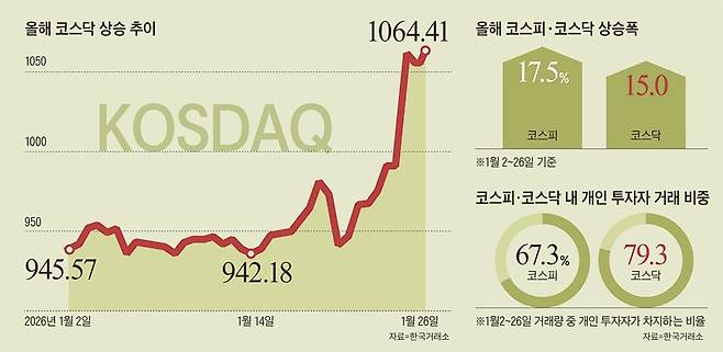 그러다 지난해 하반기부터 다시 상승세를 탔다. 작년 6월 초 이재명 정부 출범 당시 750선에 머물렀지만, 이후 40% 넘게 오르며 1000선을 넘어섰다.