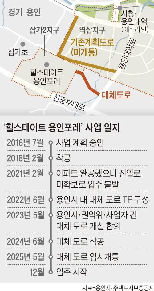공사를 완료해 놓고도 단지 진입 도로를 확보하지 못해 4년간 멈춰 있던 경기 용인시 ‘힐스테이트 용인포레’의 입주가 최근 시작됐다. 공공과 민간 사업자가 협력해 주택 공급 과정의 난제를 극복하고 국민 주거 안정에 기여한 사례로 평가된다.