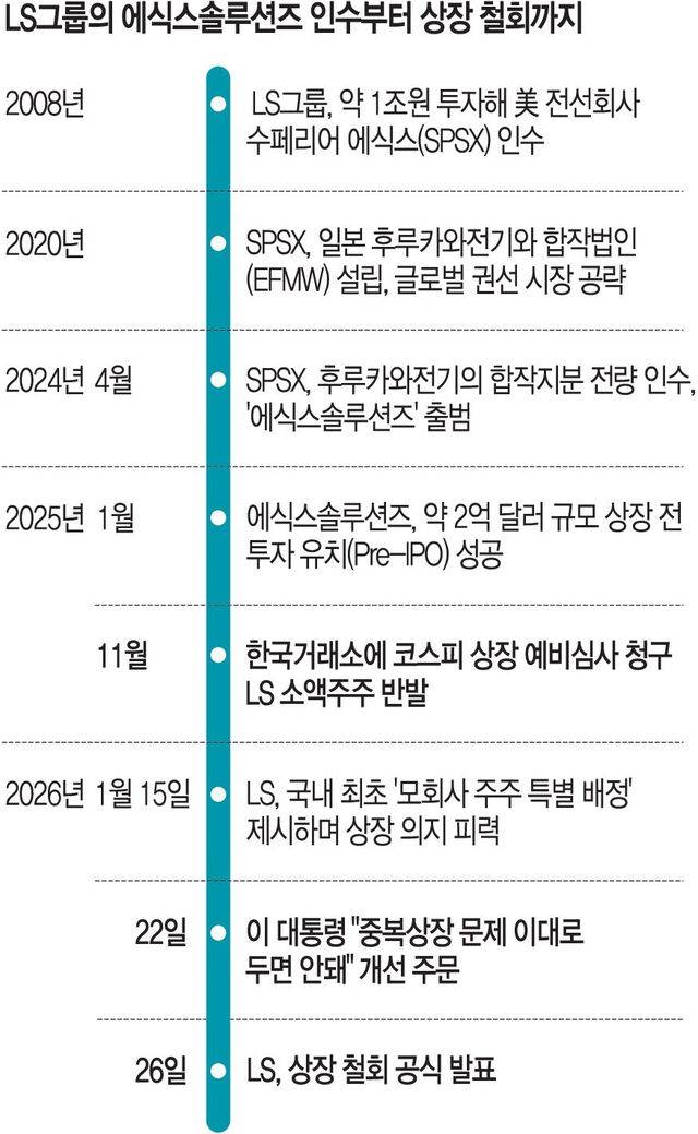 LS는 지난 21일까지만 해도 “에식스솔루션즈 상장은 모자회사 주주 모두의 가치 증대를 위한 필연적 선택”이라며 상장 의지를 굽히지 않았다. 그런데 그 이튿날부터 분위기가 급변했다. 이 대통령이 사상 처음으로 코스피 지수 5000을 찍은 이날 더불어민주당 ‘코스피 5000 특별위원회’ 위원들과의 오찬 자리에서 중복 상장 문제를 제기했다는 얘기가 흘러나왔기 때문이다. 이 대통령은 당시 ‘L 들어간 주식은 안 사’라는 제목의 언론보도를 거론하며 “이런 중복 상장 문제가 코리아 디스카운트의 원인이 된다. 허용하지 말아야 한다”는 취지로 언급했고 LS 사례를 구체적으로 지목한 것으로 알려졌다.
