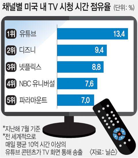 유튜브의 목표는 채널 이동 없이 하나의 서비스 안에서 TV로 할 수 있는 모든 시청 경험을 하도록 하는 것이다. 통계로도 이미 입증됐다. 시장조사업체 닐슨에 따르면 지난해 7월 기준 미국 내 TV 전체 시청 시간 중 유튜브가 차지한 비중은 13.8%로, 모든 채널 사업자 중 1위였다.