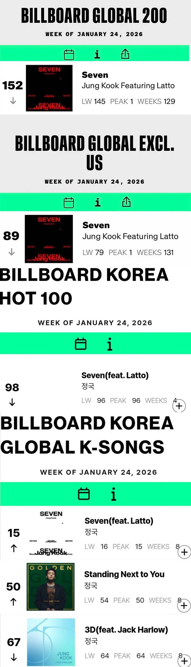 국내 차트에서도 존재감은 이어졌다. ‘Seven’은 1월 24일 자 빌보드 코리아 ‘핫 100’ 차트에 98위로 이름을 올리며 4주 연속 진입에 성공했다. 빌보드 ‘글로벌 K-송즈’ 차트에서는 ‘Seven’이 15위, ‘Standing Next to You’가 50위, ‘3D’가 67위를 기록하며 세 곡 모두 8주 연속 차트에 머물렀다.
