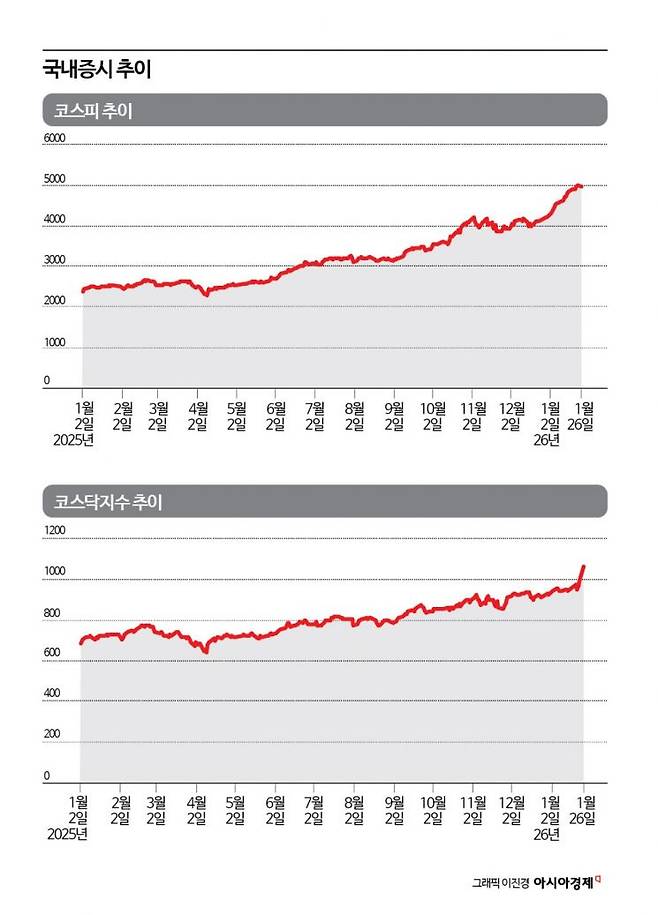 코스피가 5000선을 넘나들면서 상대적으로 덜 오른 코스닥이 주목받고 있다. 지난해 코스피는 인공지능(AI)과 반도체 사이클 회복 기대를 바탕으로 가파른 상승세를 보였지만, 코스닥지수는 변동성만 확대된 채 상승 탄력이 제한됐다. 시장에서는 코스닥지수가 올해 정부의 부양 의지에 힘입어 상승기류를 탈 것으로 보고 있다. 미국의 관세 불확실성이 단기 부담이 될 수 있겠지만 상승 추세는 변함없을 것이라는 분석도 나온다.