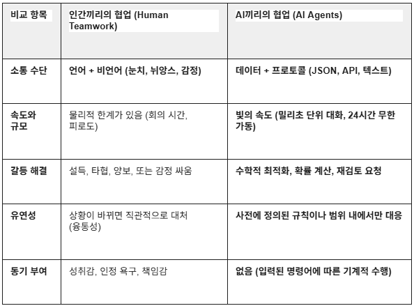 - AI의 협업은 **‘감정이 제거된 회사’**와 같습니다. 사내 정치도, 눈치도, 자존심 싸움도 없이 오직 목표만을 향해 전력 질주하는 기계적인 조직입니다.