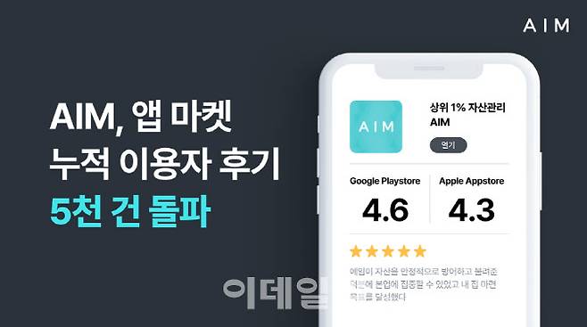 AI 자산관리 플랫폼 에임(AIM)은 앱 마켓 누적 이용자 후기가 5천 건을 돌파했다고 밝혔다.