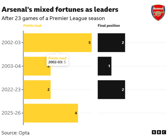 아스날은 23경기를 치른 시점에서 리그 선두에 오른 경험이 세 차례 있었다.
