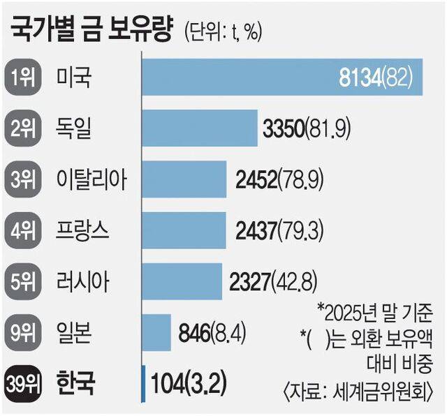 한은의 외환 보유액 중 금이 차지하는 비중은 3.2%에 그쳐 홍콩(0.1%)과 콜롬비아(1.0%)에 이어 세계 최저 수준이다. 다만 외환 보유액은 지난해 11월 말 기준 4307억 달러로 세계에서 아홉 번째로 많다.