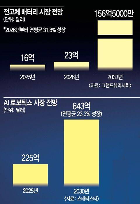 다만 전고체 배터리와 피지컬AI 모두 기술 개발 단계인 만큼 실제 로봇 시장이 배터리 업계 실적에 어느 정도 도움이 될지는 미지수라는 의견도 있다. 다른 업계 관계자는 “개인에게 보급되는 전기차 시장과 휴머노이드 시장은 격차가 클 수밖에 없고, 전고체 배터리 상용화까지는 여전히 불확실성이 많다”고 말했다.