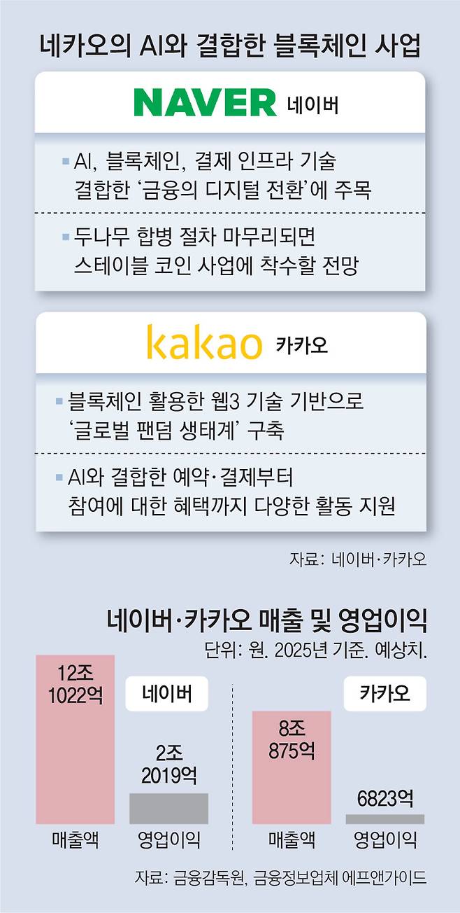 우선 네이버는 AI, 블록체인, 결제 인프라 기술을 결합한 ‘디지털 전환’에 주력하고 있다. 연간 80조 원의 결제 규모를 가진 네이버파이낸셜과 블록체인 기술 강자인 두나무의 역량을 결합해 AI와 웹3를 연결하는 금융 기술 생태계를 구축하겠다는 계획이다.