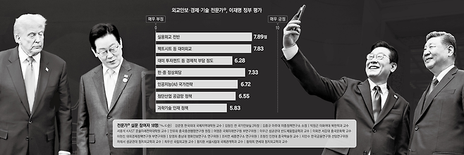 외교 분야와 비교해 정부의 첨단 기술·산업 및 이공계 인재 정책에 대한 평가는 저조했다. 과학기술 인재 확보 및 양성 정책은 평균 5.83점을 기록했다. 평균보다 낮은 점수를 준 응답자도 6명이나 됐다. ‘AI 3강’, ‘소버린 AI’ 등 정부의 AI 육성 전략은 6.72점, 첨단산업 공급망 보호 정책은 6.55점을 받는 데 그쳤다.