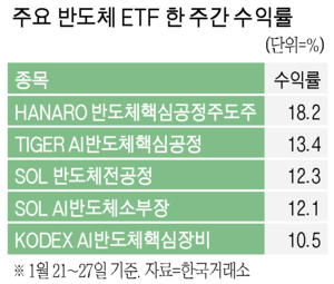 27일 한국거래소에 따르면 이날 기준 최근 일주일간 반도체 테마 ETF(레버리지 제외) 가운데 가장 높은 수익률을 기록한 것은 NH아문디자산운용의 HANARO 반도체핵심공정주도주였다. 해당 ETF는 이 기간에 18.2%의 수익률을 냈다. 이외에도 TIGER AI반도체핵심공정(13.4%), KIWOOM K-반도체북미공급망(12.9%), SOL 반도체전공정(12.3%) 등이 단기간 높은 수익률을 기록하며 상위권에 올랐다.