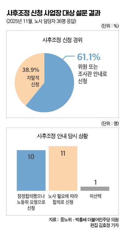 이번 전수조사는 지난해 8~9월 경기지노위 조사관이 노동위 조정종료 이후 노사 간 자율교섭에 따라 잠정합의를 한 사업장을 방문해 사후조정 신청을 요청한 사실이 알려지면서 시작됐다. 당시 조사관이 사후조정 신청을 권유한 사업장은 알려진 곳만 3곳이었다.<본지 2025년 10월14일자 2면 "이미 타결한 사업장에, 경기지노위 조사관 '사후조정 신청해 달라'" 기사 참조>