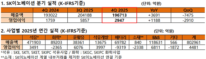 4분기 사업별 실적은 △석유사업 매출 11조7114억원, 영업이익 4749억원 △화학사업 매출 2조1211억원, 영업손실 89억원 △윤활유사업 매출 9896억원, 영업이익 1810억원 △석유개발사업 매출 3227억원, 영업이익 810억원 △배터리사업 매출 1조4572억원, 영업손실 4414억원 △소재사업 매출 172억원, 영업손실 752억원 △SK이노베이션 E&S 사업 매출 3조379억원, 영업이익 1176억원을 각각 기록했다.