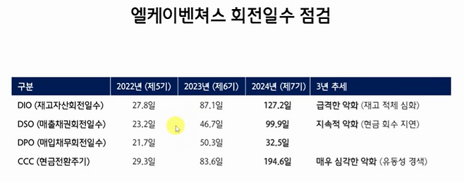 회사의 위기는 수치로 분명하게 드러난다. 재고자산 회전일수는 30일에서 127일로, 매출채권 회전일수는 23일에서 99일로 늘어났고 그에 따라 현금흐름이 막히기 시작했다. 직원 급여, 이자, 운영비 등 미지급 비용도 8억 원 수준에서 33억 원까지 늘어나며 실질적 유동성 위기를 겪고 있다. 회계법인은 결국 ‘계속기업으로서의 존속 가능성에 중대한 의문’이 있다는 판단을 내리기에 이르렀다.