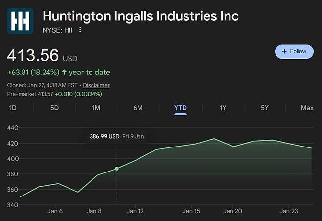 회사의 주가는 뉴욕 증시서 올 들어만 18.2%(26일 기준) 상승한 413.56달러를 기록 중이다. 지난해 초부터 1년간 상승률은 103.7%로 현재 사상 최고치에 근접해 있다. 도널드 트럼프 미국 행정부가 지난해 12월 플로리다 마러라고에서 이 신형 전함 계획을 발표하며 '황금 함대' 구상을 구체화하는 등 군함 수요가 계속 늘어날 것이란 기대가 주가에 반영됐다는 평가다.