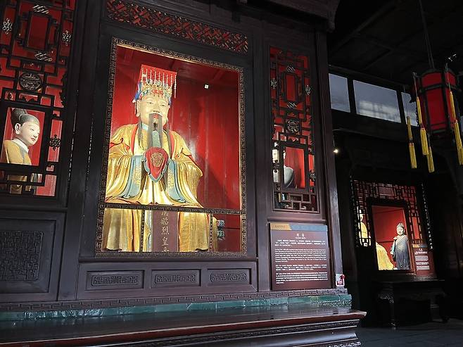 | ▲ 무후사의 '조연' 유비(왼쪽)와 손자인 유심의 인물상(오른쪽 감실 안)이 보인다. 정작 2대 황제 유선의 인물상은 없다. |