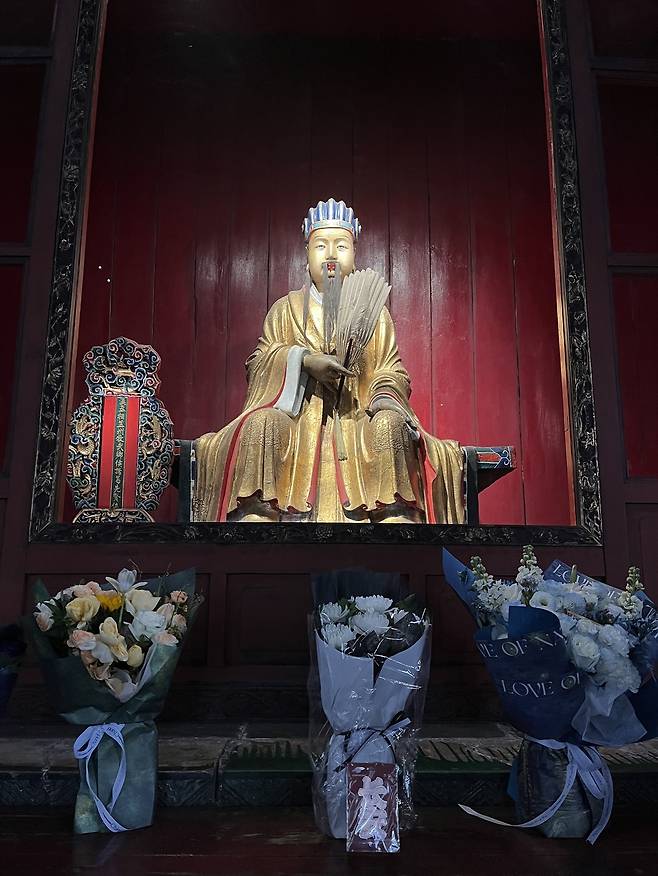 | ▲ 백우선을 손에 든 제갈량 앞에는 꽃다발이 여러 개 놓여 있다. 향을 봉헌하려는 이들도 줄을 선다. 유비의 인물상 앞에서는 보기 드문 풍경이다. |