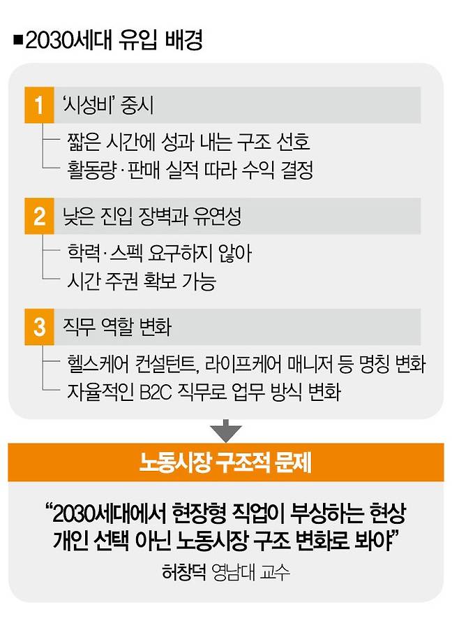 그렇다면 청년들은 왜 현장형 일자리를 선택하는 걸까. 답은 간단하다. 이 흐름은 '시성비(시간 대비 성능 효율)'를 중시하는 젊은 세대의 특성과 맞물려 있다. 2030세대는 오랜 시간 조직에 묶여 일하는 방식보다 짧은 시간에 가시적인 성과를 내는 구조를 선호하는데, 이런 성향이 활동량과 판매 실적이 연동되는 '현장형 일자리'와 맞닿는다.