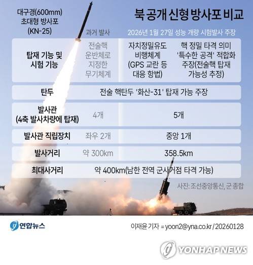 (서울=연합뉴스) 이재윤 기자 = 북한은 28일 김정은 국무위원장이 지켜보는 가운데 성능을 개량한 대구경(600㎜) 방사포 무기체계를 전날 시험사격했다고 밝혔다.