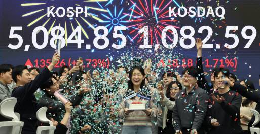 [27일 서울 중구 우리은행 딜링룸에서 관계자들이 세리머니를 하고 있다. 이날 코스피는 전장보다 135.26포인트(2.73%) 오른 5,084.85로 장을 마감했다. 코스닥 지수도 전장보다 18.18포인트(1.71%) 오른 1,082.59로 거래를 마쳤다. (사진=연합뉴스)]