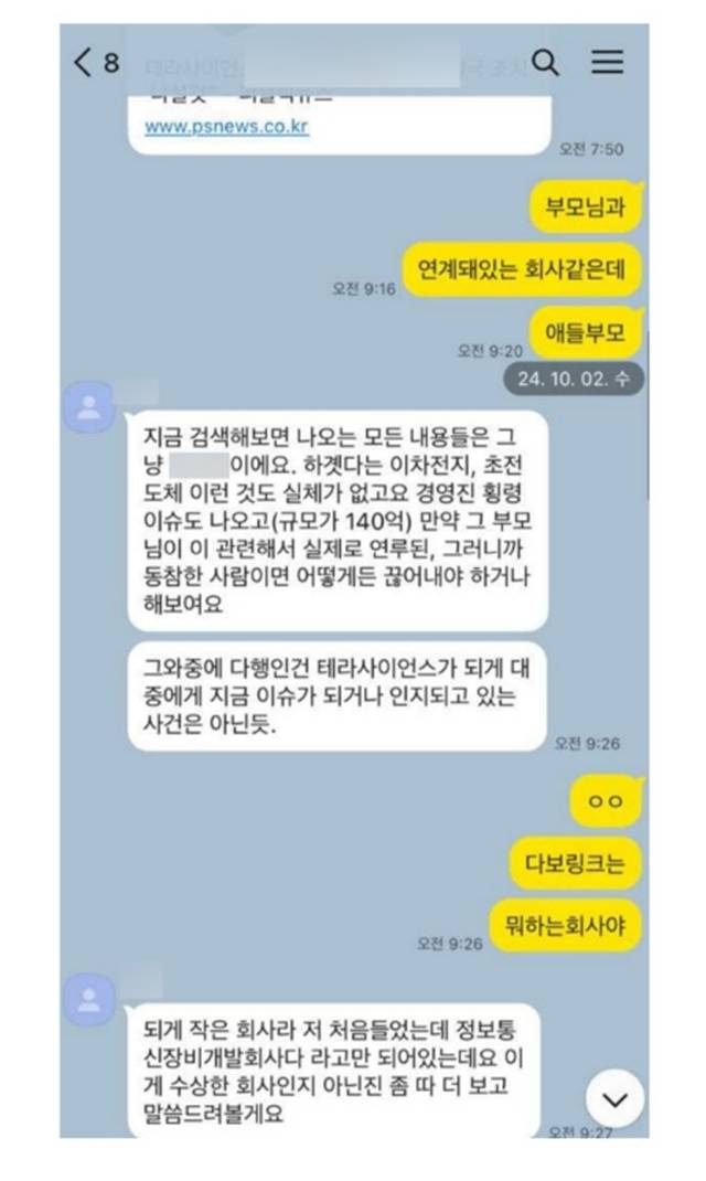 대화록 중 유독 시선을 사로잡은 부분은 이재상 CEO와 민 전 대표가 나눈 대화였다. 민 전 대표 측이 공개한 음성 대화에 따르면, 이재상 CEO는 “요즘 또 이상한 루머 들은 거 있다. 테라 사이언스 다보링크 혹시 들어보셨냐?”라고 묻고 있고, 민 전 대표는 “전혀 모르겠는데. 그게 뭔데? 그게 무슨 회산데”고 답한다. 이에 그러자 이재상 CEO는 “그런 친구들이 희진님 주변에 좀 접속을 했다는 첩보가 들어왔다. 걱정되서 그런다, 만나지 말라. 만났다는 게 아니라. 똥파리가 꼬일 거거든”이라고 조언하고, 민 전 대표는 “솔직히 투자 이런 거에 관심도 없을뿐더러 지금은 하이브가 나를 이렇게 죽이려고 드르렁대고 있는데 내가 미쳤다고 누구 만나서 소문나면은 지X 떨 거 뻔한데 내가 그러겠냐. 여기보다 훨씬 유명한 회사들도 연락이 오는데, 이름만 딱 들으면 아는 곳들이 연락이 오는데 안 만나고 있다. 그러니까 하이브도 그게 낫다니까. 내가 어디 가서 뭐하는 것보다 그냥 여러가지로 생각해보라”고 답변한다.