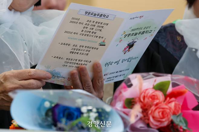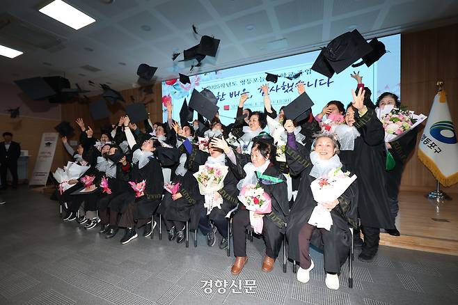 서울 영등포구청에서 28일 특별한 졸업식이 열렸다. 만학도를 위한 2025학년도 늘푸름학교 졸업식이다. 학사모를 쓴 어르신 45명(초등반 20명·중학반 25명)은 양손에 꽃다발과 졸업장을 들고 ‘늦깎이’ 졸업의 기쁨을 나눴다.